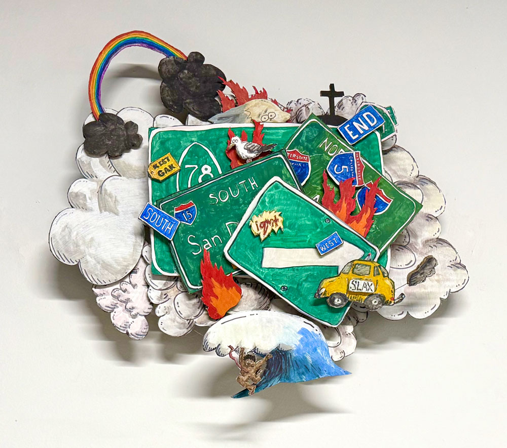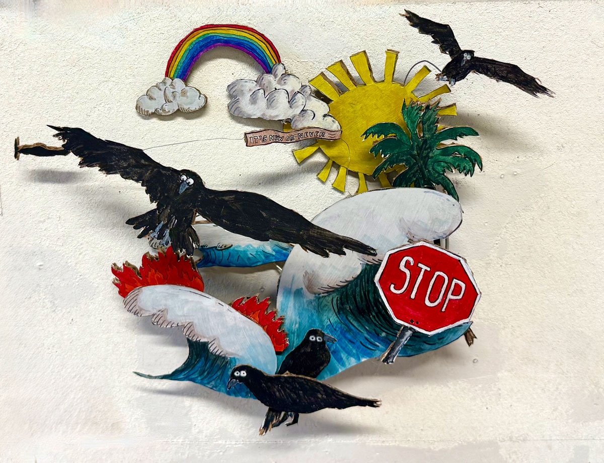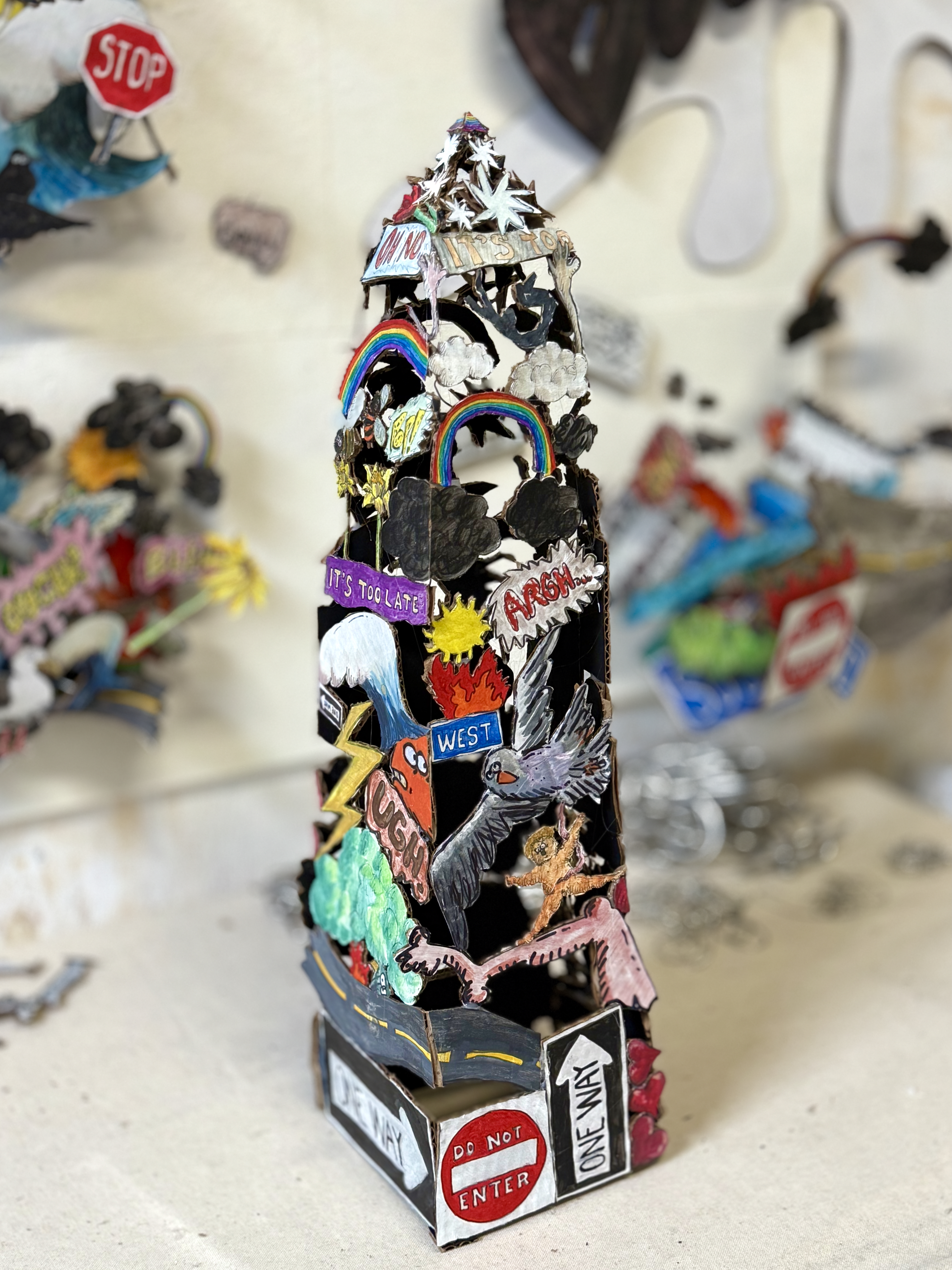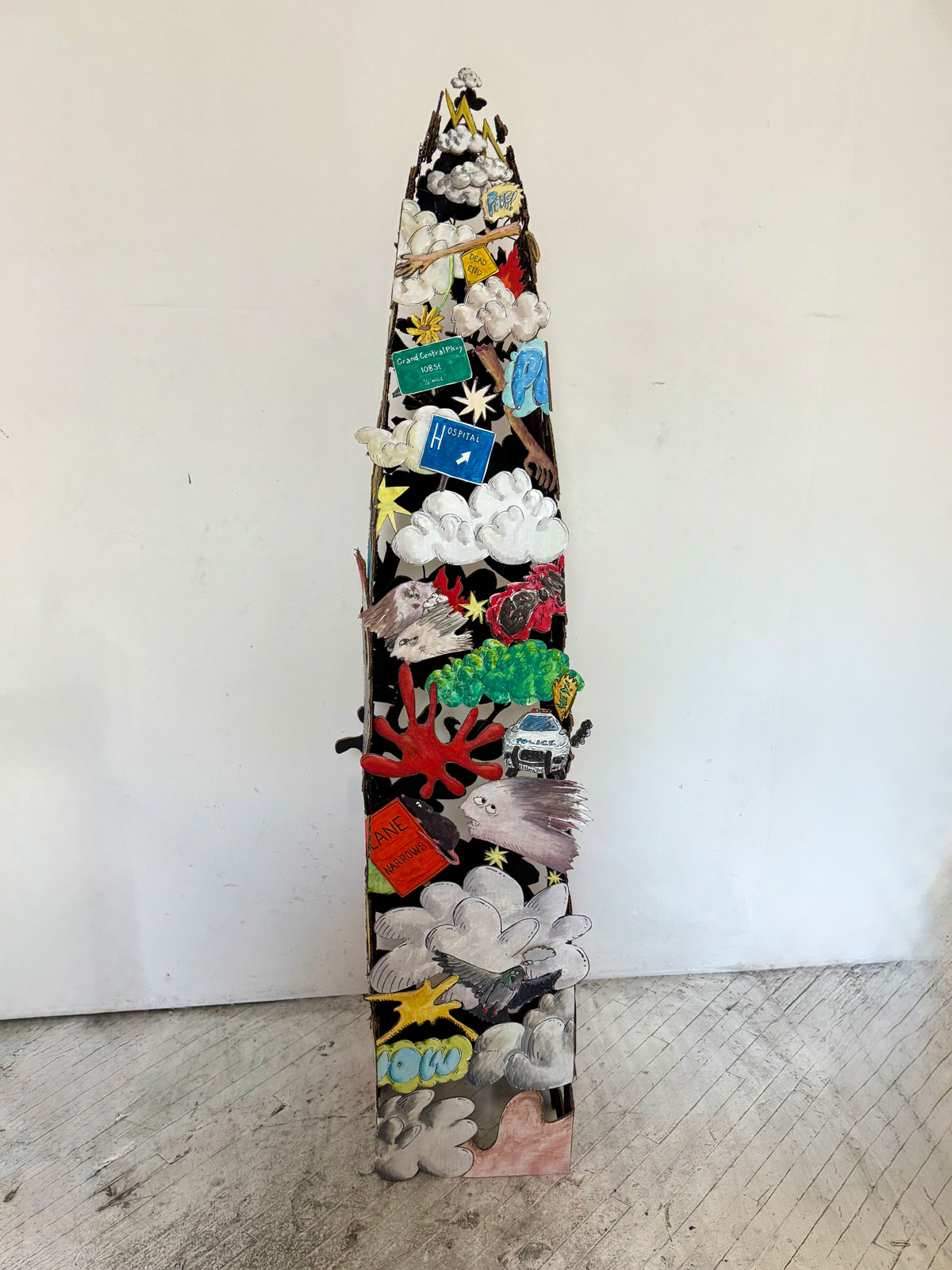 Cardboard, Gesso, Marker, Watercolor Paint, Hot Glue, wire.