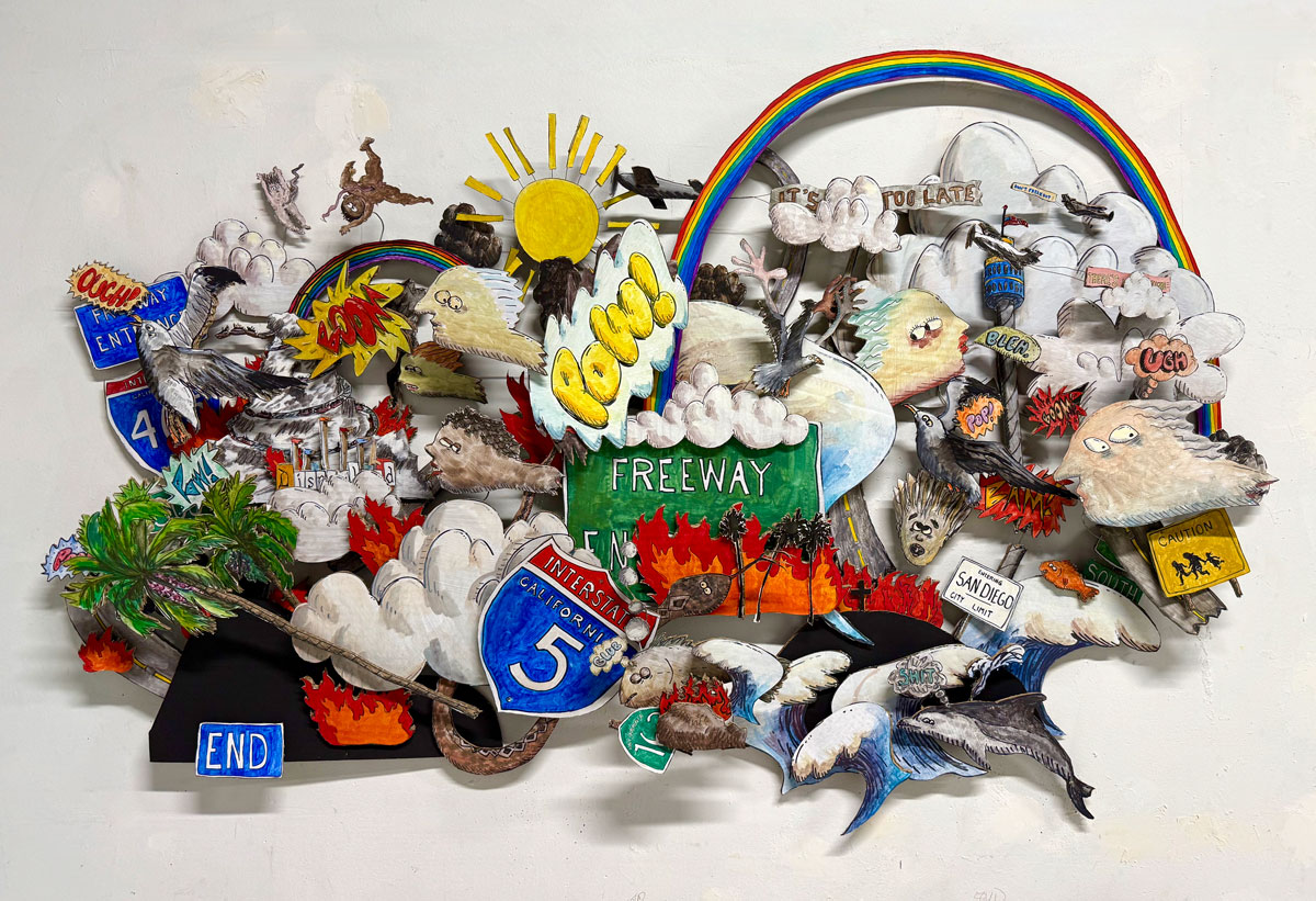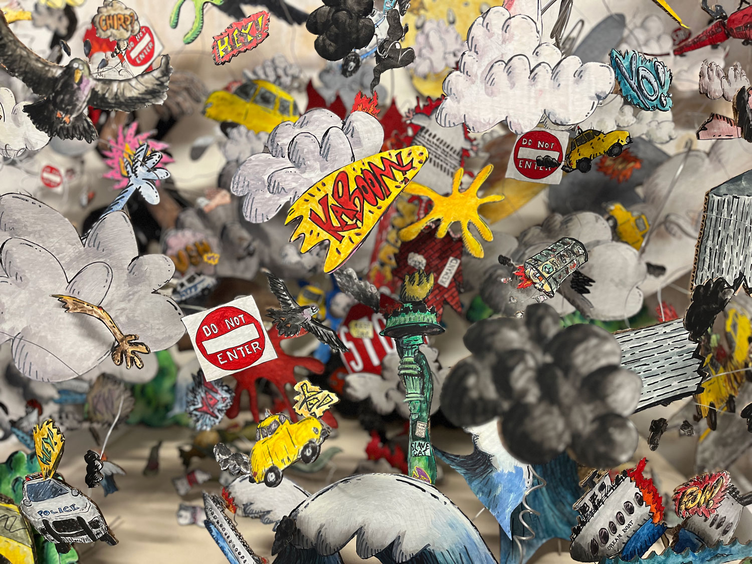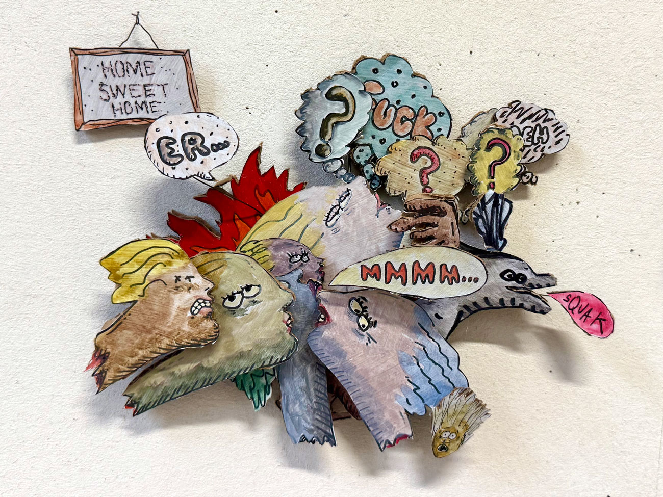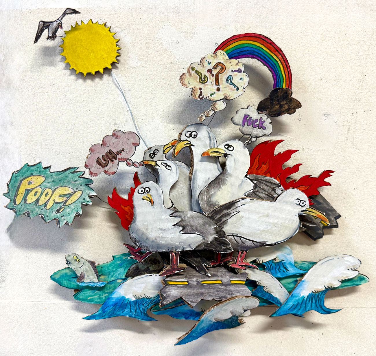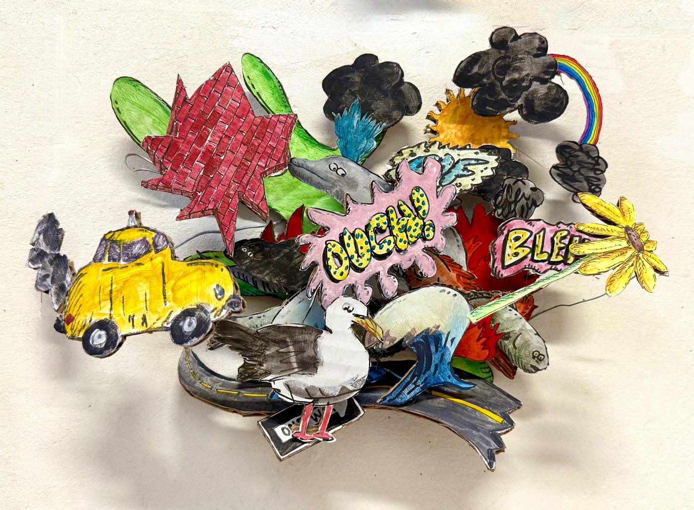 Cardboard, Gesso, Marker, Watercolor Paint, Hot Glue, wire.